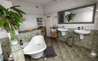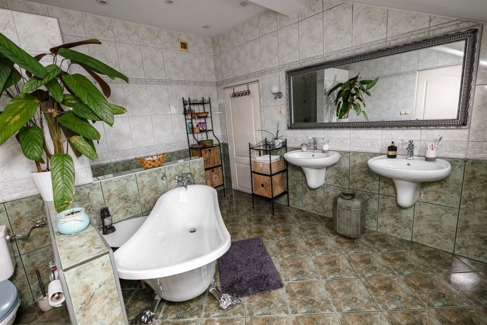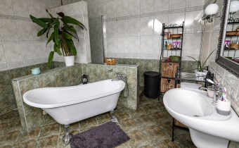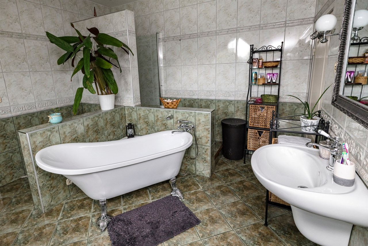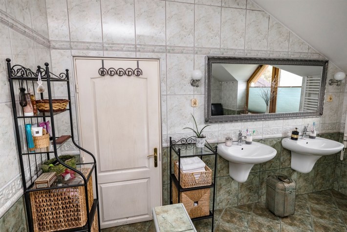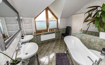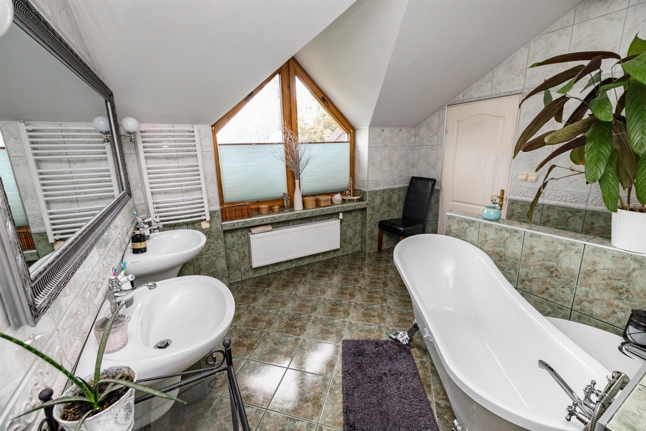 Na półpietrze pokój kąpielowy z wanną oraz przejściem do pralni, pokój.