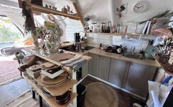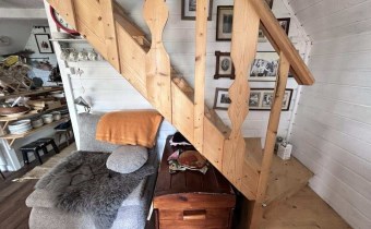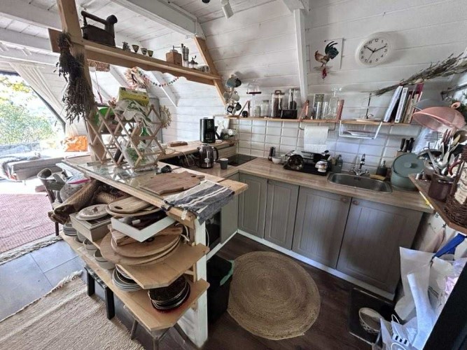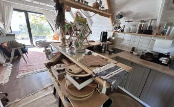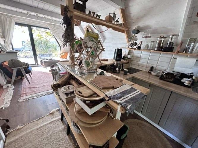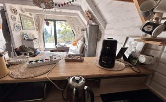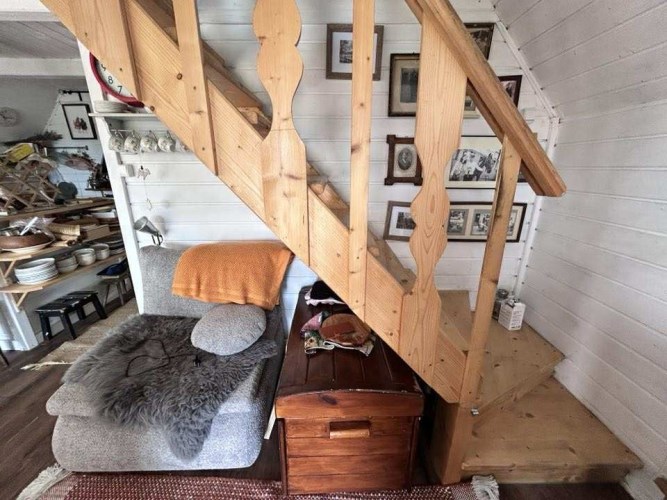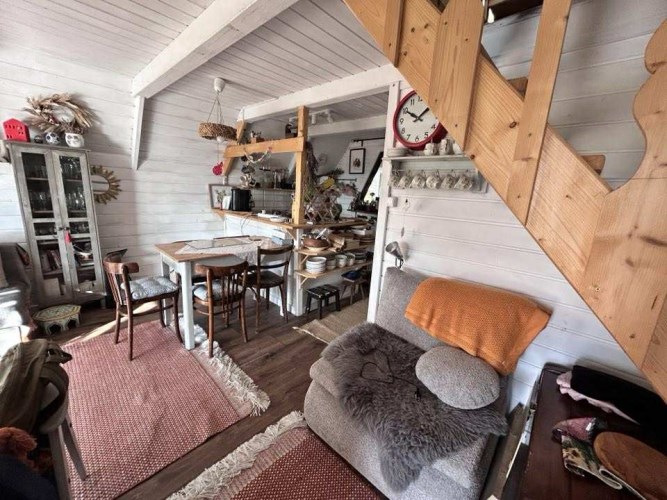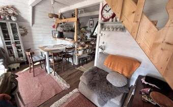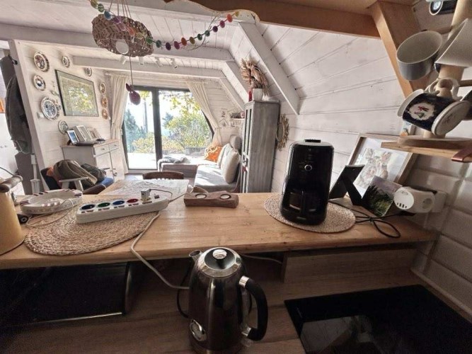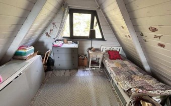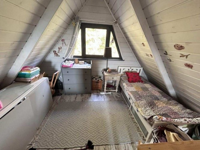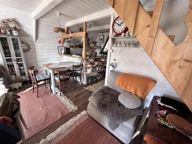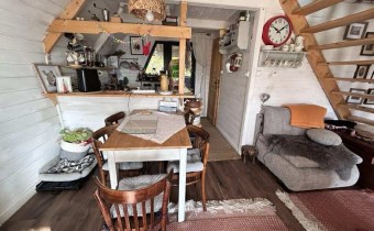 Rozkład pomieszczeń: Na parterze znajduje się pokój dzienny o powierzchni 20 m² z wyjściem na widokowy taras (16,47 m²), aneks kuchenny (5 m²), łazienka z WC (4,61 m²) oraz wiatrołap. Na poddaszu użytkowym mieszczą się dwie sypialnie. Dom pełnił funkcję całorocznej bazy rekreacyjnej, jednak po niewielkich dostosowaniach może być również domem całorocznym.