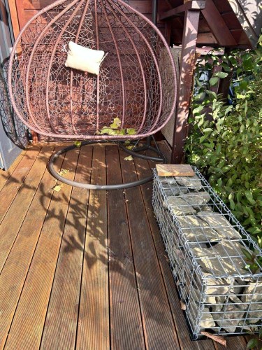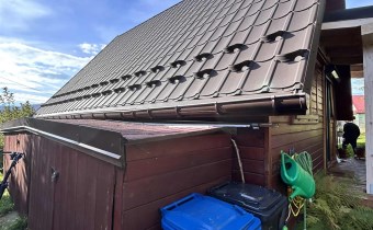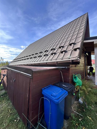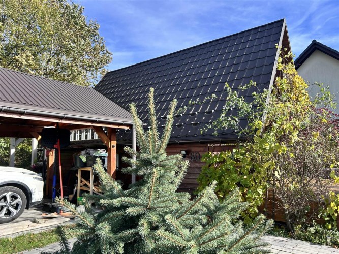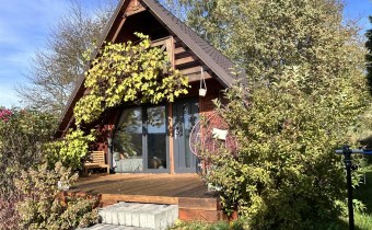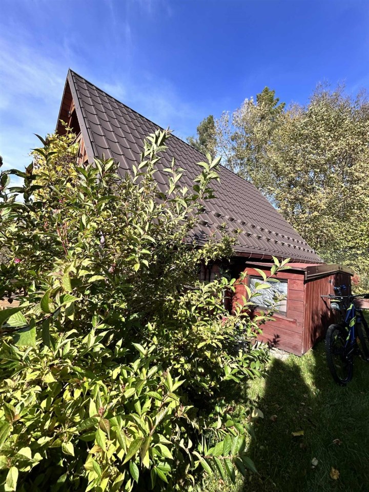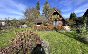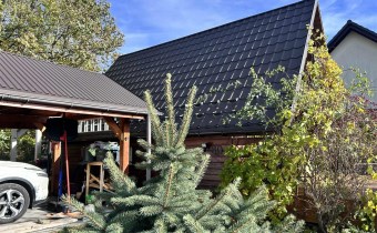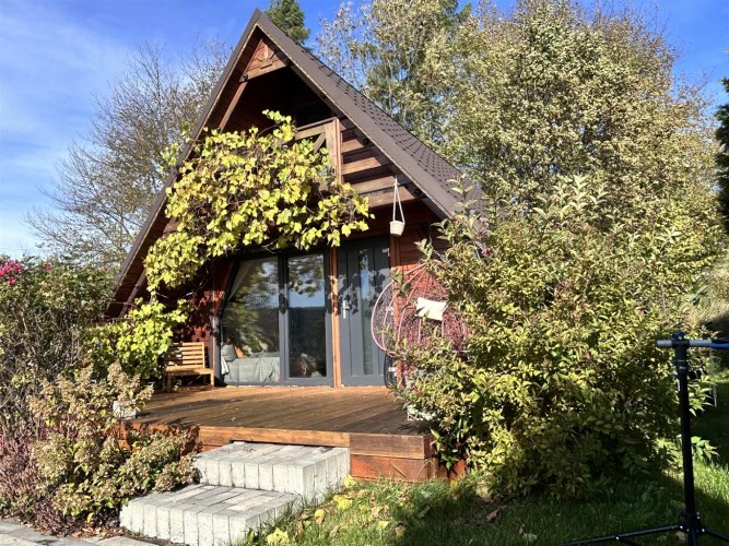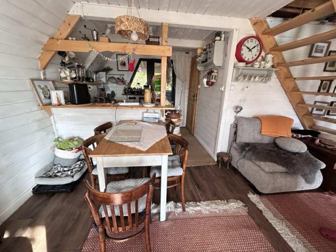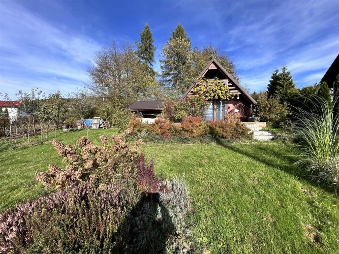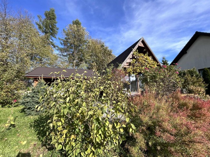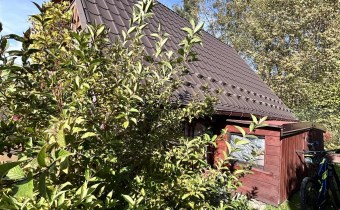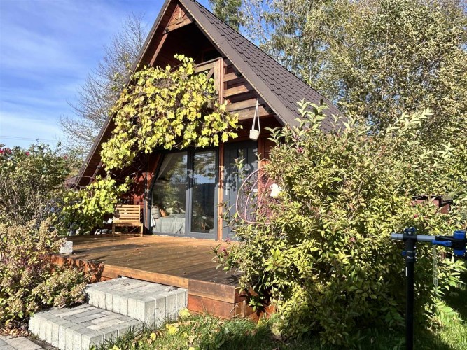 Działka: Dom położony jest na ogrodzonej działce o powierzchni 550 m² z bramą wjazdową. Działka jest urokliwie zagospodarowana — rosną tu jabłonie, maliny, krzewy ozdobne i tuje, które zapewniają prywatność i kameralny klimat. W sąsiedztwie znajdują się głównie domy całoroczne.