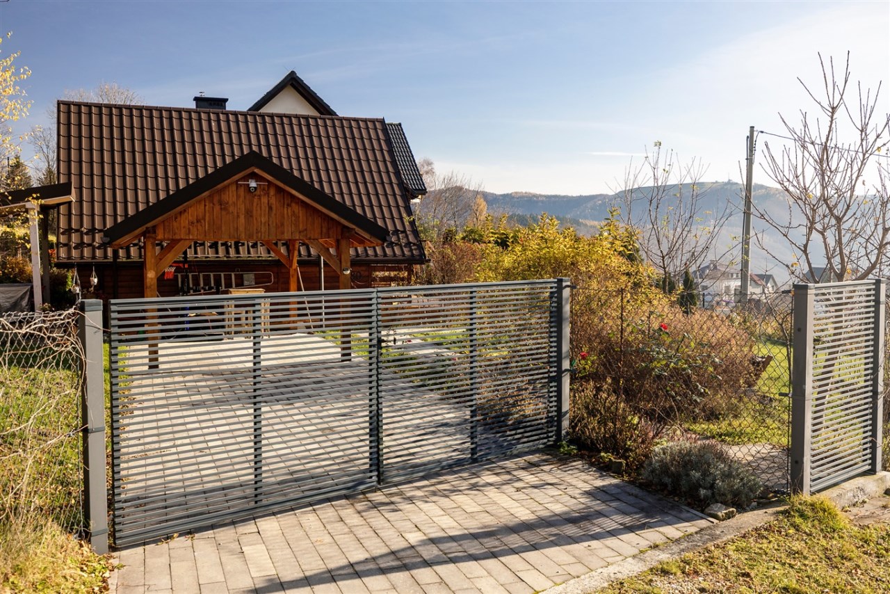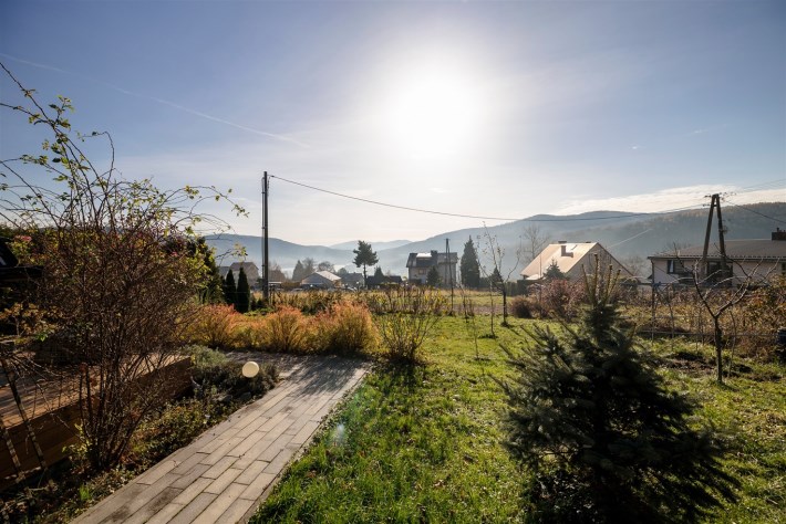 Z działki rozciąga się spektalularny widok; widać stąd Górę Żar, taflę jeziora międzybrodzkiego i często Babią Górę.
