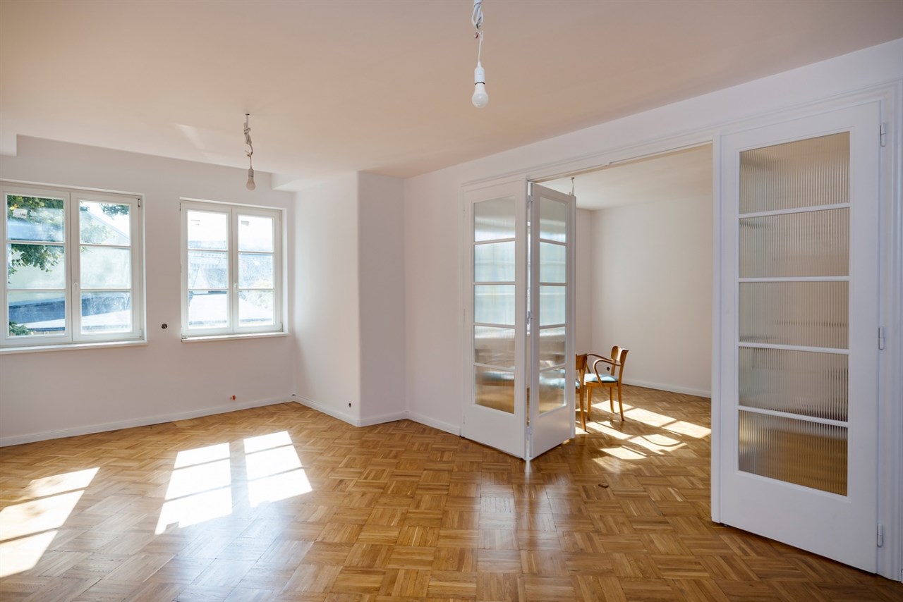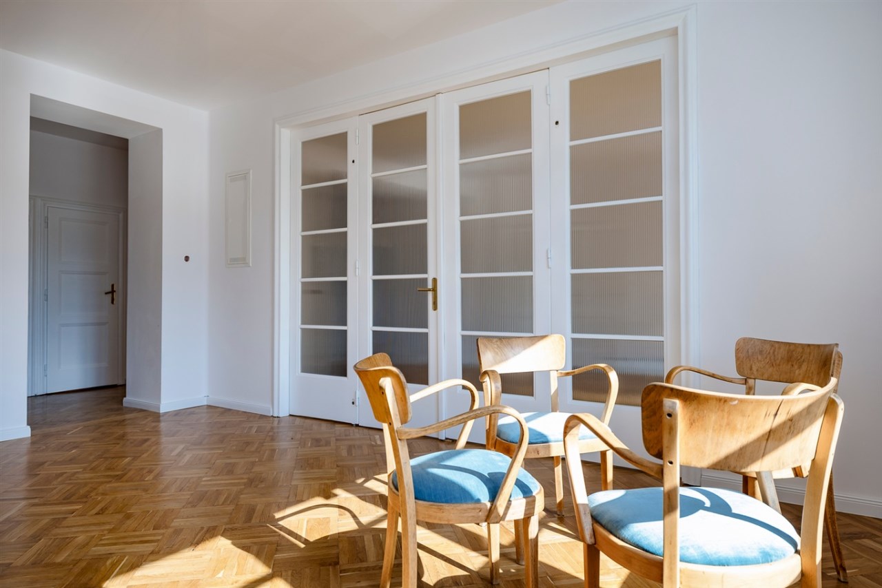 Uwagę oglądających przyciagają spektakularne drzwi łączące kuchnię i jadalnię z salonem. Zachowanie tych drzwi i ich renowacja, to jedno z najlepszych posunięć właścicieli tego jakże niezwykłego mieszkania. Ich wielofuncyjna rola jest nie do przecenienia: łaczą i dzielą kuchnię i jadalnię z salonem; w zależności od stopnia otwarcia zmieniaja przestrzeń nie tylko poprzez powiększenie czy pomniejszenie ich wielkości, lecz pozwalają na grę światła dziennego w pomieszczeniach. A to właśnie światło wpadajace z zewnątrz jest tu pierwszoplanowym czarodziejem.