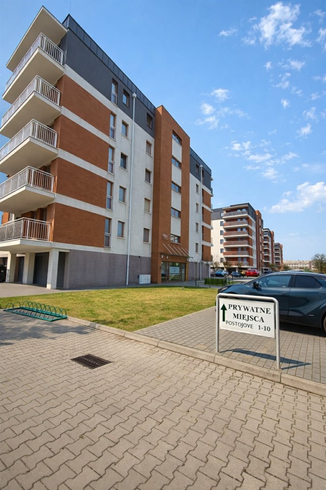 z dużym balkonem, położony na drugim piętrze w bloku z windą i własnym miejscem postojowym.